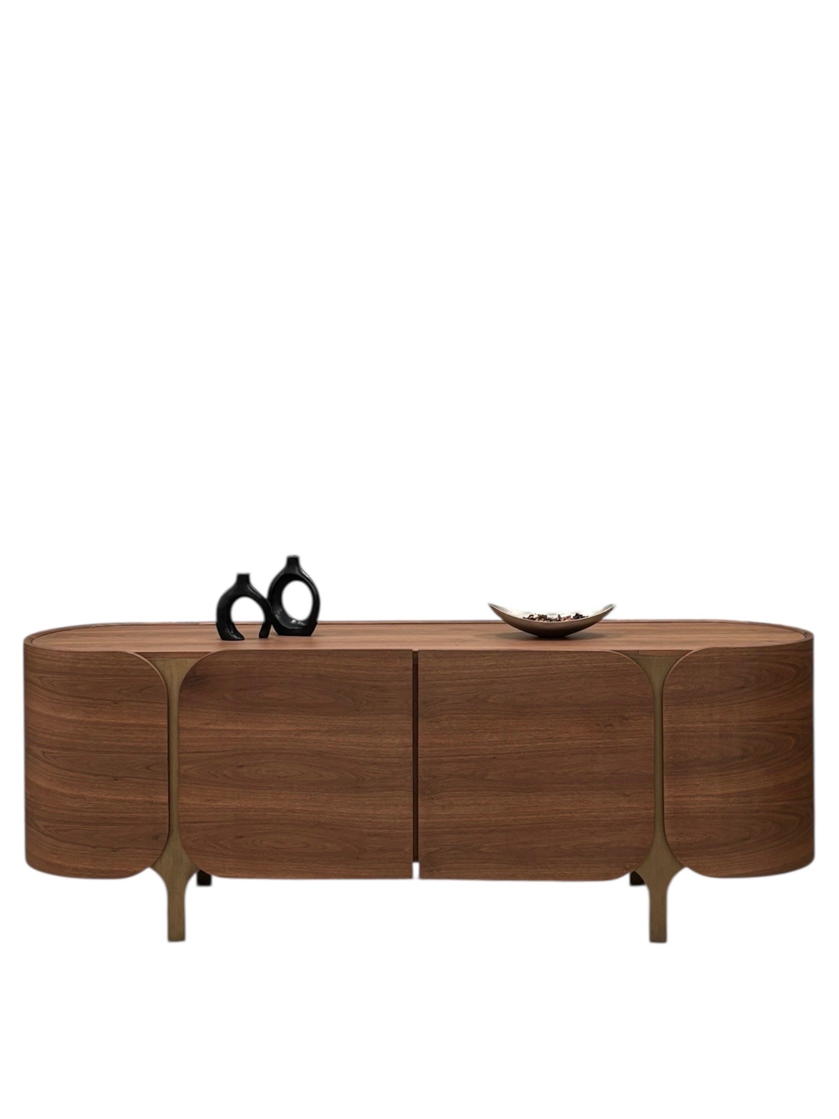 The Terra Buffet is a statement in sculptural elegance and modern craftsmanship. Featuring a smooth, curved silhouette in rich walnut wood, it’s supported by gracefully contoured bronze-toned legs that blend seamlessly into the design. Four front-facing cabinet doors offer generous hidden storage, making it as practical as it is beautiful. With its warm tones and minimalist form, the Terra Buffet brings refined sophistication to any dining or living space.